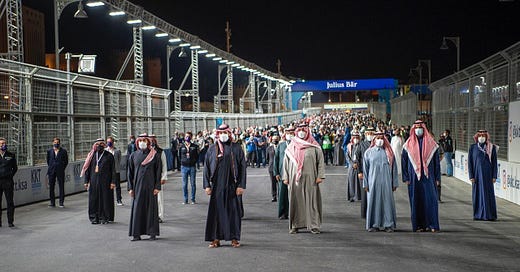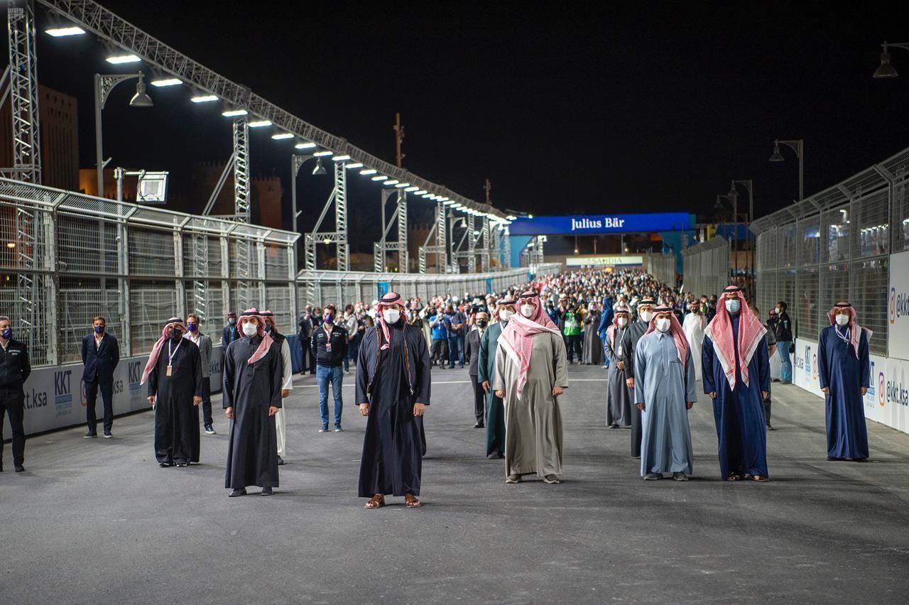 As Crown Prince Mohammed bin Salman walked steadily with a small entourage on a car racecourse in Riyadh on Saturday night, well-wishers shouted from distance. “Salamat! Salamat!” one of them said. The prince waved and thanked them from behind his white face mask before pausing for the national anthem as he stood ahead of Formula E…
